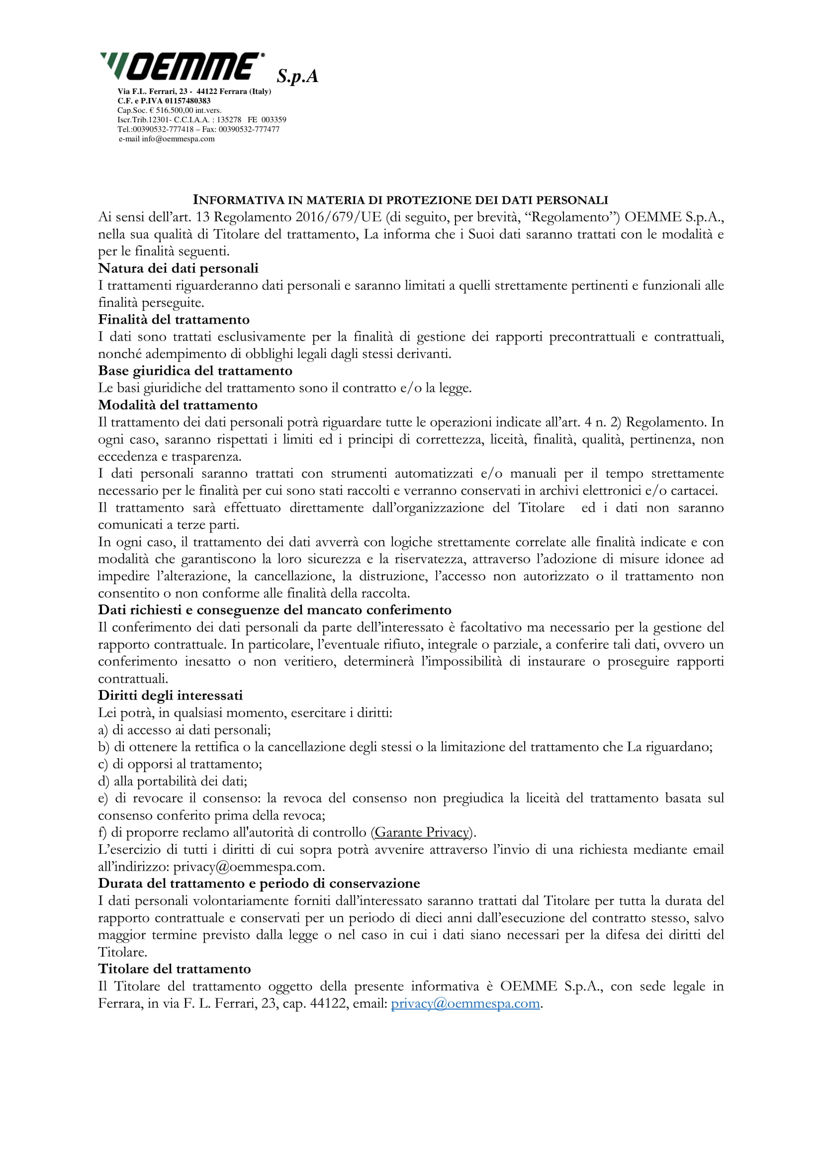 OEMME S.p.A. - Cap. Soc. € 516.500,00 int. vers. - Cod. Fisc. e P.IVA IT 01157480383 - Iscr. Trib. 12301 - C.C.I.A.A. 135278 FE 003359 - powered by CEMA NEXT - Agenzia di Comunicazione Ferrara