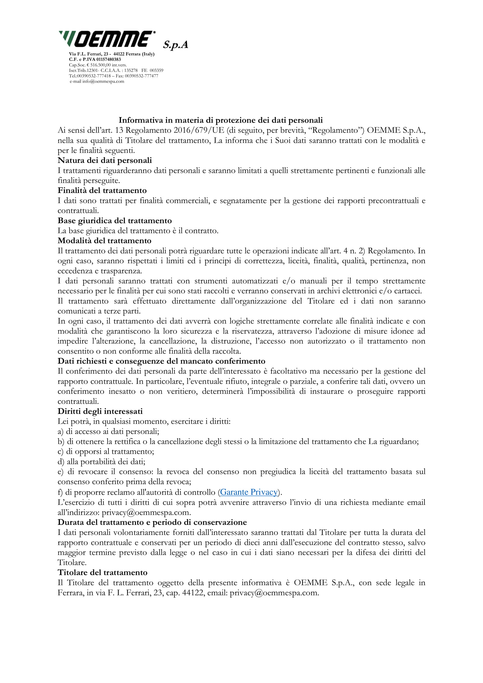 OEMME S.p.A. - Cap. Soc. € 516.500,00 int. vers. - Cod. Fisc. e P.IVA IT 01157480383 - Iscr. Trib. 12301 - C.C.I.A.A. 135278 FE 003359 - powered by CEMA NEXT - Agenzia di Comunicazione Ferrara